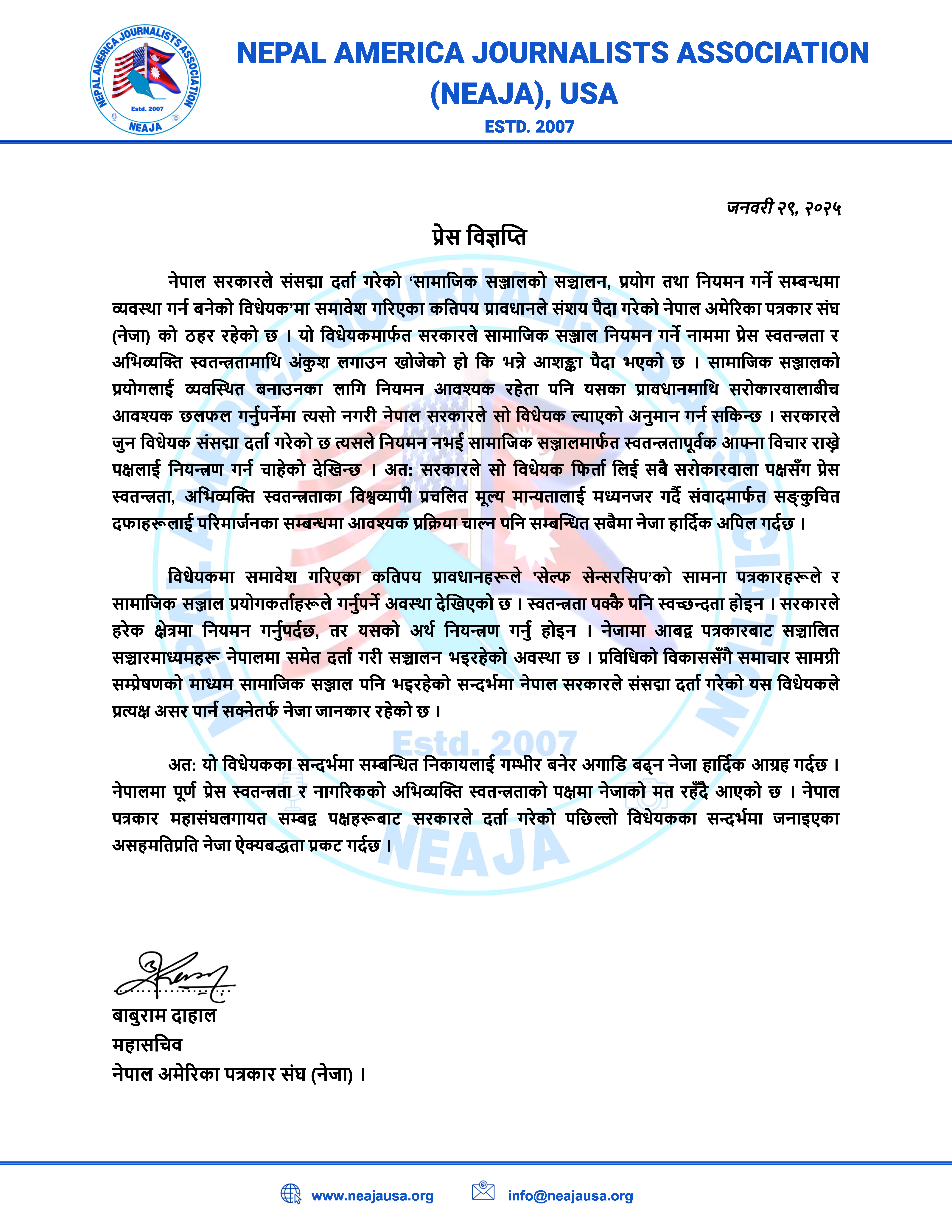 न्यू योर्क। नेपाल अमेरिका पत्रकार संघ (नेजा) ले नेपाल सरकारले संसद्मा दर्ता गरेको ‘सामाजिक सञ्जालको सञ्चालन, प्रयोग तथा नियमन गर्ने सम्बन्धमा व्यवस्था गर्न बनेको विधेयक फिर्ता लिन अनुरोध गरेको छ । नेजाले विज्ञप्ती जारी गर्दै विधेयकले प्रेस स्वतन्त्रता र अभिव्यक्ति स्वतन्त्रतामाथि अंकुश लगाउन खोजेकोले विधेयक फिर्ता लिन नेपाल सरकारलाई अनुरोध गरेको हो। सरकारले संसद्मा दर्ता गरेको विधेयकले नियमन नभई सामाजिक सञ्जालमार्फत स्वतन्त्रतापूर्वक आफ्ना विचार राख्ने पक्षलाई नियन्त्रण गर्न खोजेको नेजाको ठहर छ। नेजाको विज्ञप्ती जस्ताको तस्तै।