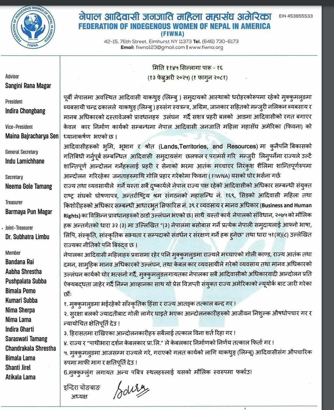 आदिवासीहरूको भुमि, भूभाग र श्रोत (Lands, Territories, and Resources) मा कुनै पनि बिकासको गतिबिधी गर्नुपूर्ब सम्बन्धित आदिवासी समुदायसँग छलफल र परामर्श गरी मन्जुरी लिनुपर्नेमा राज्यले उल्टै शान्तिपूर्ण आन्दोलन गर्नेहरूलाई प्रहरी र सेनाको आडमा आतंक मच्चाएर निरंकुश शैलिमा शान्तिपूर्णरुपमा आन्दोलन गरिरहेका जनताहरुमाथि गोलि प्रहार गरेकोमा फिवनाले एक विज्ञप्ती जारी गर्दै घोर भत्र्सना गरेको छ। फिवनाको विज्ञप्ती जस्ताको तस्तै ।
