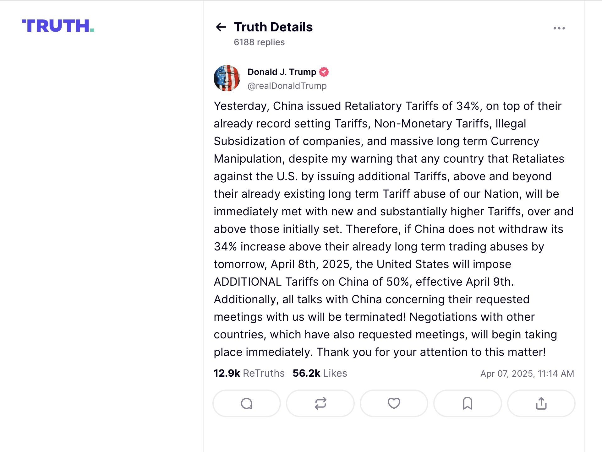 अमेरिकाले वृद्धि गरेको करबाट रिसाएको चिनले अमेरिकी उत्पादनमा ३४ प्रतिशत करको घोषणा गरेको थियो। त्यसबाट आक्रोशित राष्ट्रपति डोनाल्ड ट्रम्पले सामाजिक सञ्जाल ट्रुथमा अप्रिल ९ बाट लागू हुने गरि चिनियाँ उत्पादनमा थप ५० प्रतिशत अतिरिक्त कर लगाउने घोषणा गरेका थिए। ह्वाइट हाउस प्रेस सेक्रेटरी क्यारोलिन लेभिटले अप्रिल ८ मा नयाँ अतिरिक्त करको घोषणा गरेकी हुन्।