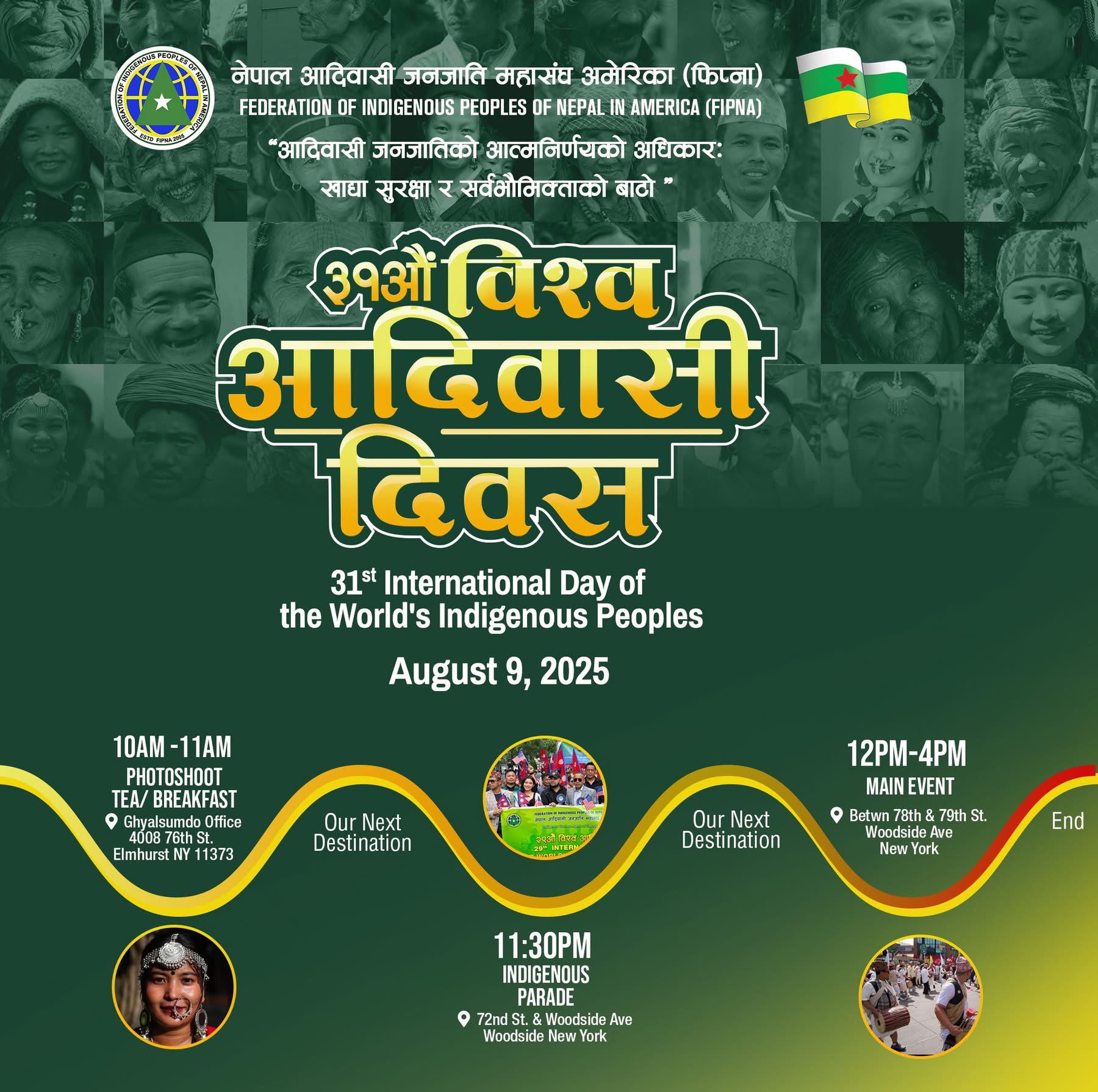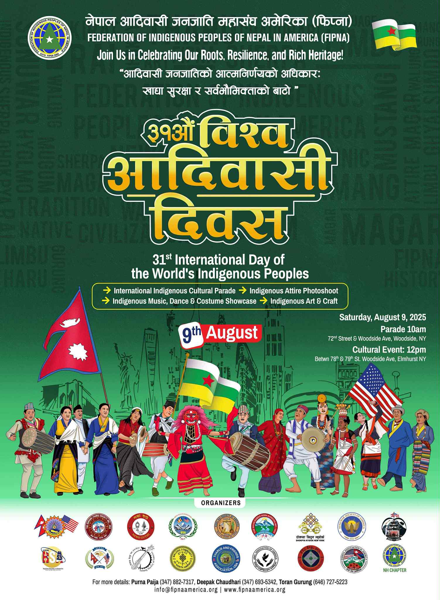 फिप्नाका अध्यक्ष तोरण गुरूङले न्यूयोर्कमा रहेका १८ वटा संस्थाका नेपाली आदिवासी जनजाति समुदायहरूले जनजातिहरूका मातृभाषा र लोक भाकामा बनेका गीत, सांस्कृतिक झाँकी र विभिन्न जातिय भेषभूषासहित उडसाईड एभन्युको ७२ स्ट्रिट देखि ७८ स्ट्रिटको मध्यभाग सम्म र्यााली गरेर मञ्चमा साँस्कृतिक कार्यक्रम गरी ३१ औं विश्व आदिवासी जनजाति दिवस मनाउन लागेको जानकारी दिए।