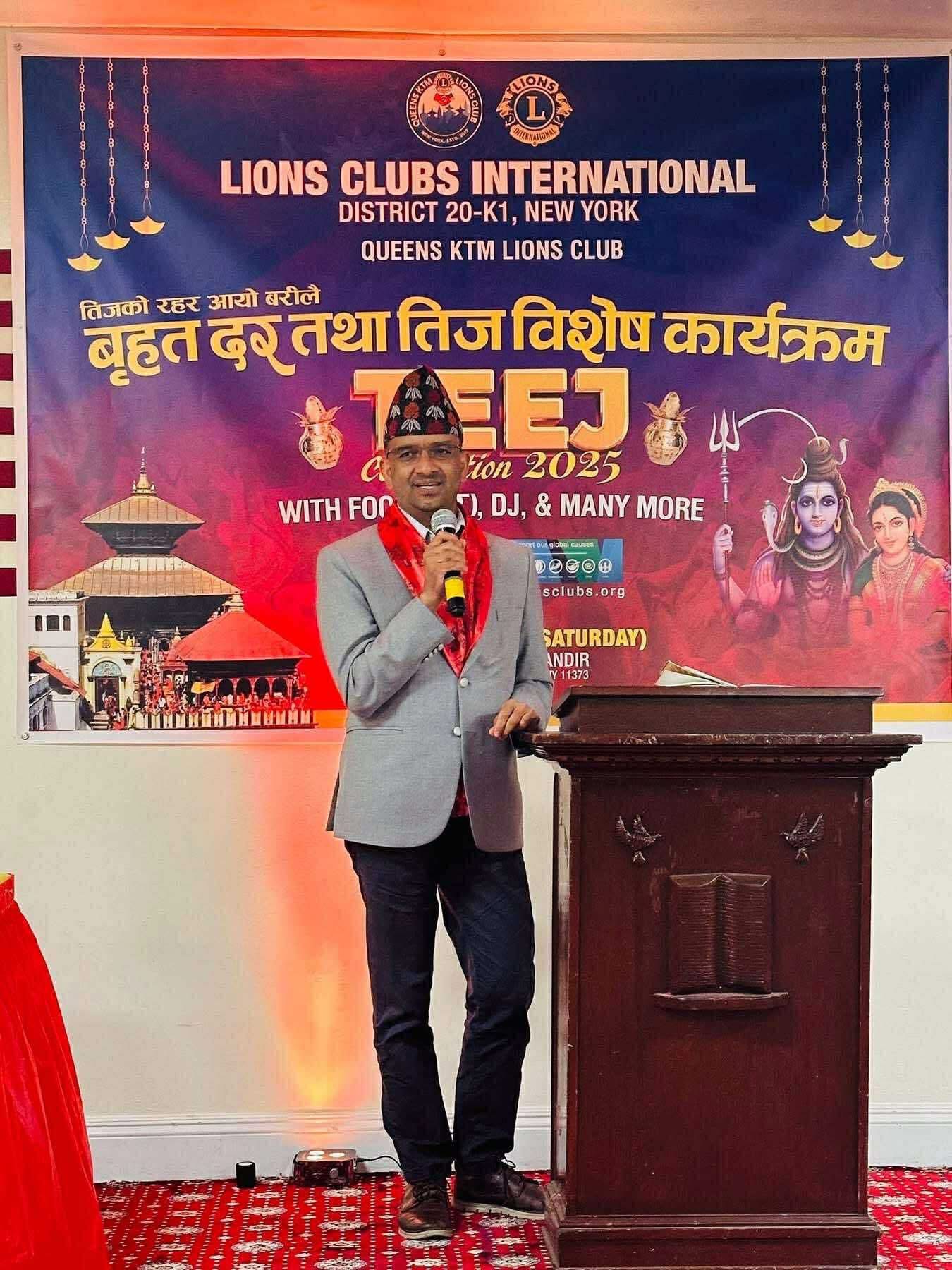 न्यू योर्क । क्विन्स केटिएम लायन्स क्लब न्यू योर्कले हिन्दु नारीहरुको महान पर्व तिज विशेष कार्यक्रम भव्यताका साथ सम्पन्न गरेको छ। क्लवले नेपाली हिन्दु महिलाहरुको पर्व तीजलाई लक्षित गरी कार्यक्रम आयोजना गरिएको हो । कार्यक्रमको प्रमुख अतिथि न्यूयोर्कस्थित नेपाली महावाणिज्यदूत दधिराम भण्डारीले तिज जस्ता पर्वहरूले प्रवासमा बसोबास गर्ने नेपालीलाई आफ्नो मौलिक संस्कृति, परम्परा र पहिचान जोगाउन महत्वपूर्ण भूमिका खेलेको बताए । महावाणिज्यदूत भण्डारीले प्रवासमा गरिएका यस्ता कार्यक्रमहरूले नेपाली समुदायलाई अझ नजिक ल्याउने मात्र नभई नयाँ पुस्तामा संस्कृतिको मुल्य र महत्व बुझाउने अवसर प्रदान गर्ने बताए।
